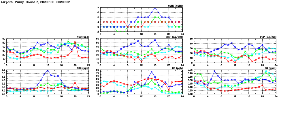 | Air Quality Data Time Series in Airport, Pump House 5 (2020/01/05) | ( Line colors: Day -3 Day -2 Day -1 Current day ) | 2D Map Current AQHI |