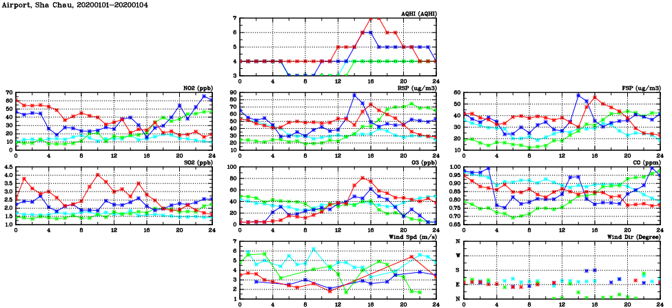 | Air Quality Data Time Series in Airport, Sha Chau (2020/01/04) | ( Line colors: Day -3 Day -2 Day -1 Current day ) | 2D Map Current AQHI |