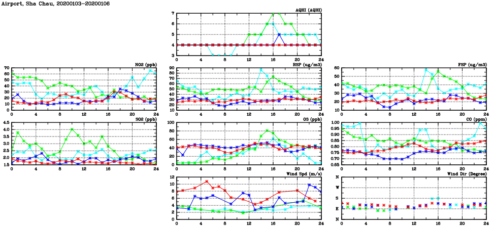 | Air Quality Data Time Series in Airport, Sha Chau (2020/01/06) | ( Line colors: Day -3 Day -2 Day -1 Current day ) | 2D Map Current AQHI |