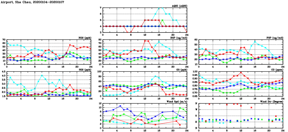 | Air Quality Data Time Series in Airport, Sha Chau (2020/01/07) | ( Line colors: Day -3 Day -2 Day -1 Current day ) | 2D Map Current AQHI |
