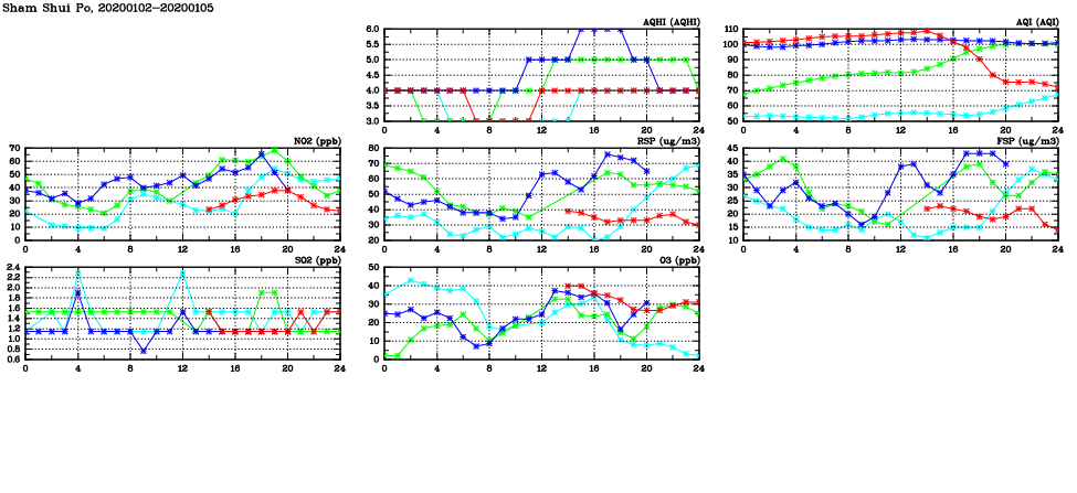| Air Quality Data Time Series in Sham Shui Po (2020/01/05) | ( Line colors: Day -3 Day -2 Day -1 Current day ) | 2D Map Current AQHI |