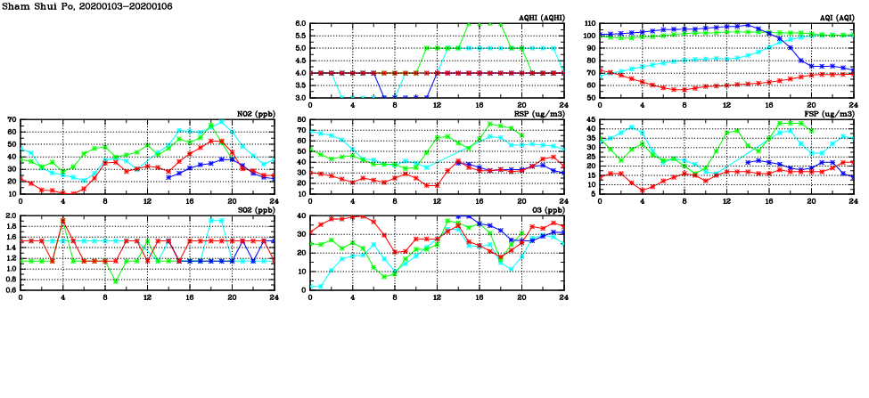 | Air Quality Data Time Series in Sham Shui Po (2020/01/06) | ( Line colors: Day -3 Day -2 Day -1 Current day ) | 2D Map Current AQHI |