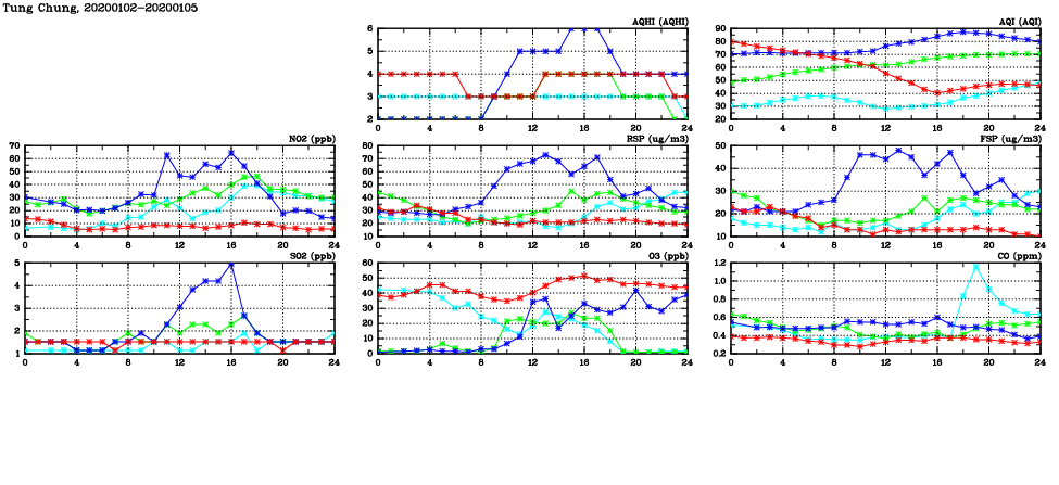 | Air Quality Data Time Series in Tung Chung (2020/01/05) | ( Line colors: Day -3 Day -2 Day -1 Current day ) | 2D Map Current AQHI |