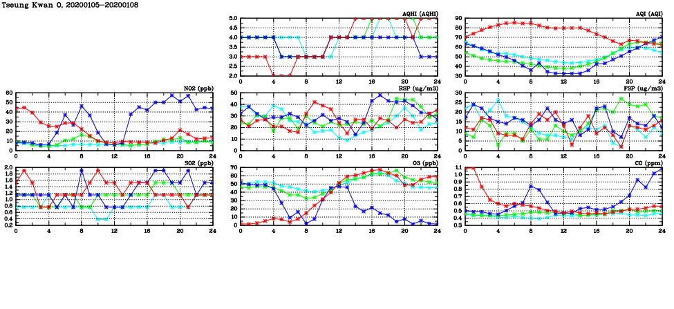 | Air Quality Data Time Series in Tseung Kwan O (2020/01/08) | ( Line colors: Day -3 Day -2 Day -1 Current day ) | 2D Map Current AQHI |