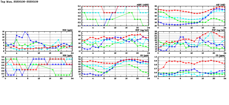| Air Quality Data Time Series in Tap Mun (2020/01/09) | ( Line colors: Day -3 Day -2 Day -1 Current day ) | 2D Map Current AQHI |