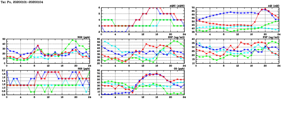 | Air Quality Data Time Series in Tai Po (2020/01/04) | ( Line colors: Day -3 Day -2 Day -1 Current day ) | 2D Map Current AQHI |