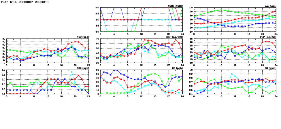 | Air Quality Data Time Series in Tuen Mun (2020/01/10) | ( Line colors: Day -3 Day -2 Day -1 Current day ) | 2D Map Current AQHI |