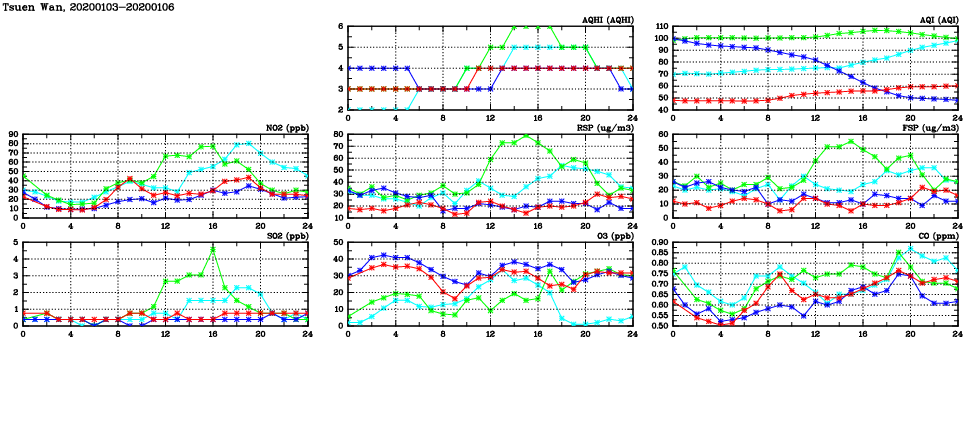 | Air Quality Data Time Series in Tsuen Wan (2020/01/06) | ( Line colors: Day -3 Day -2 Day -1 Current day ) | 2D Map Current AQHI |