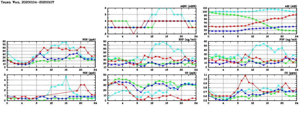 | Air Quality Data Time Series in Tsuen Wan (2020/01/07) | ( Line colors: Day -3 Day -2 Day -1 Current day ) | 2D Map Current AQHI |