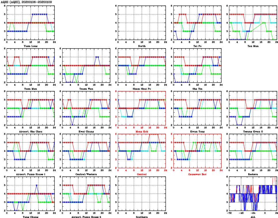| Air Quality Data Time Series for AQHI (2020/01/09) | ( Line colors: Day -3 Day -2 Day -1 Current day ) | 2D Map Current AQHI |