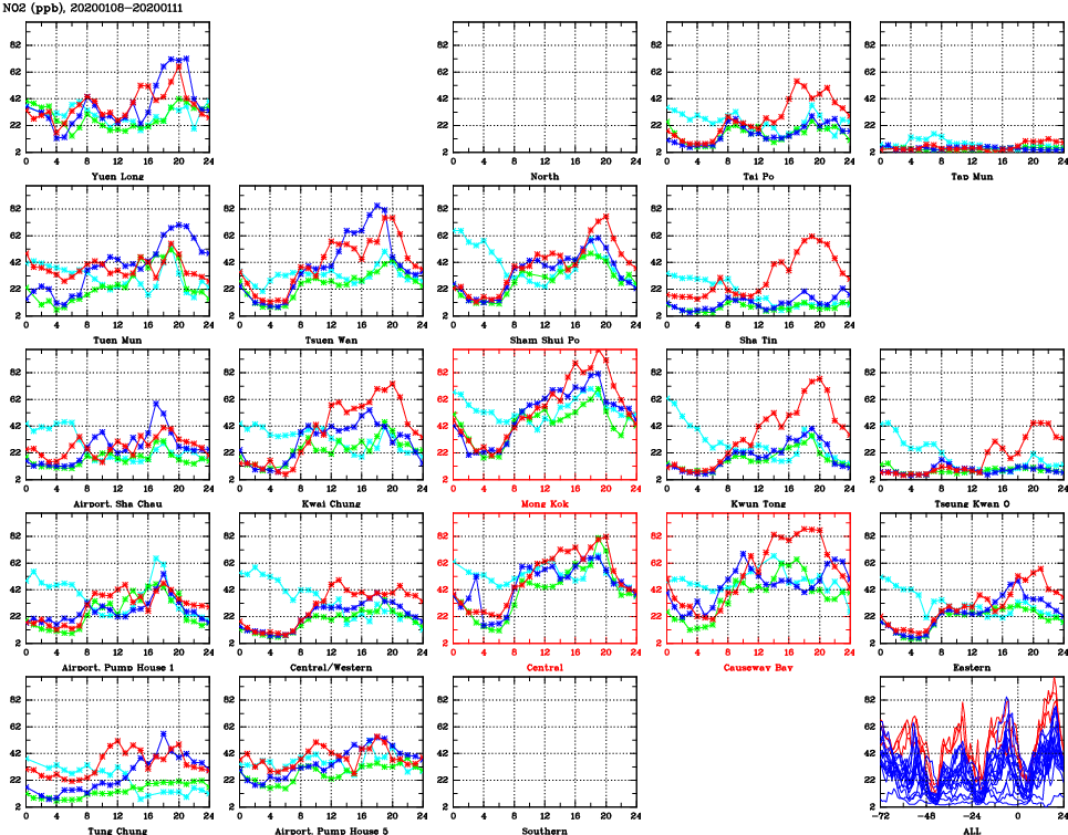 | Air Quality Data Time Series for NO2 (2020/01/11) | ( Line colors: Day -3 Day -2 Day -1 Current day ) | 2D Map Current AQHI |
