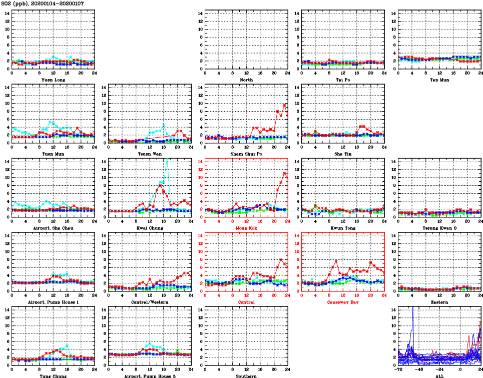 | Air Quality Data Time Series for SO2 (2020/01/07) | ( Line colors: Day -3 Day -2 Day -1 Current day ) | 2D Map Current AQHI |