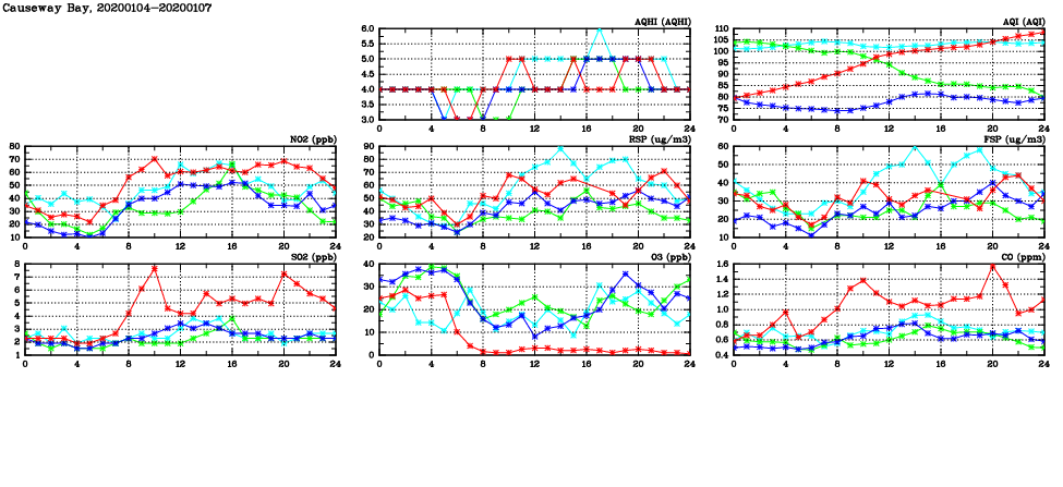 | Air Quality Data Time Series in Causeway Bay (2020/01/07) | ( Line colors: Day -3 Day -2 Day -1 Current day ) | 2D Map Current AQHI |