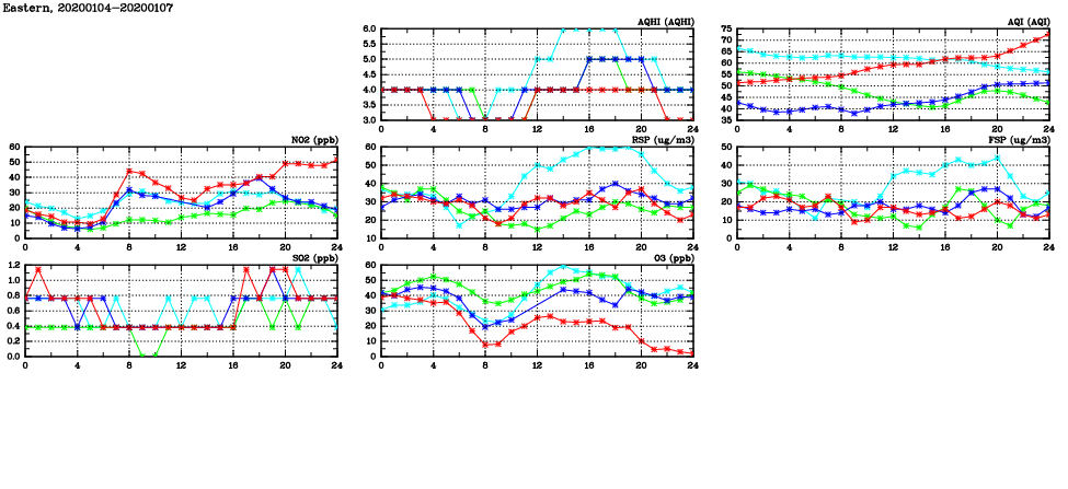 | Air Quality Data Time Series in Eastern (2020/01/07) | ( Line colors: Day -3 Day -2 Day -1 Current day ) | 2D Map Current AQHI |