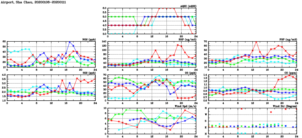 | Air Quality Data Time Series in Airport, Sha Chau (2020/01/11) | ( Line colors: Day -3 Day -2 Day -1 Current day ) | 2D Map Current AQHI |
