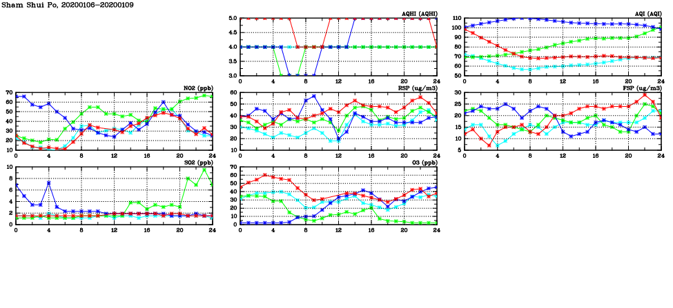 | Air Quality Data Time Series in Sham Shui Po (2020/01/09) | ( Line colors: Day -3 Day -2 Day -1 Current day ) | 2D Map Current AQHI |