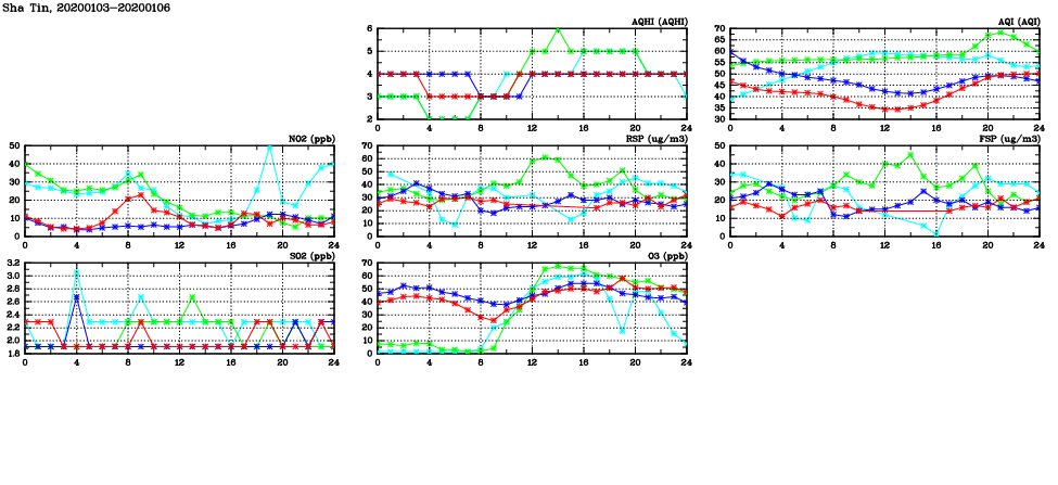 | Air Quality Data Time Series in Sha Tin (2020/01/06) | ( Line colors: Day -3 Day -2 Day -1 Current day ) | 2D Map Current AQHI |