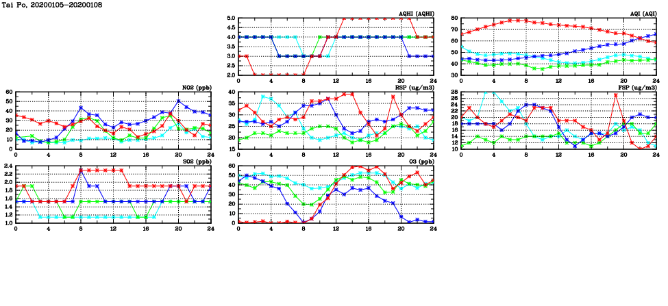| Air Quality Data Time Series in Tai Po (2020/01/08) | ( Line colors: Day -3 Day -2 Day -1 Current day ) | 2D Map Current AQHI |