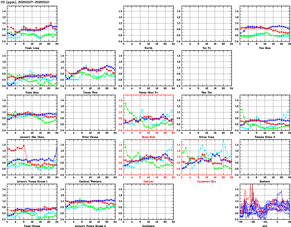 | Air Quality Data Time Series for CO (2020/01/10) | ( Line colors: Day -3 Day -2 Day -1 Current day ) | 2D Map Current AQHI |