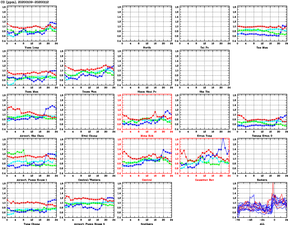 | Air Quality Data Time Series for CO (2020/01/12) | ( Line colors: Day -3 Day -2 Day -1 Current day ) | 2D Map Current AQHI |