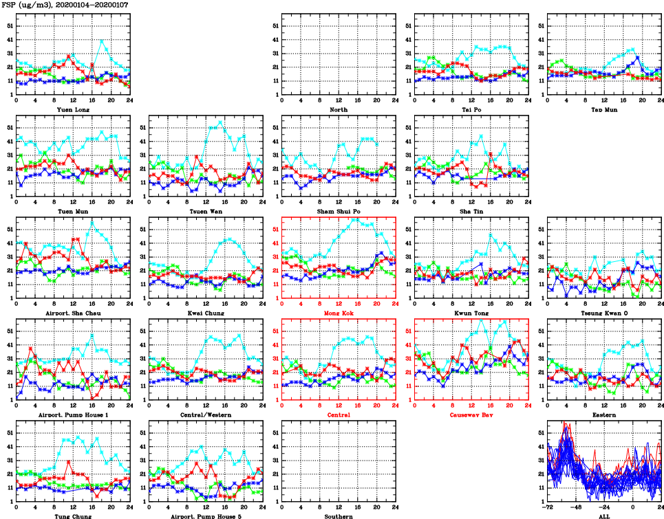 | Air Quality Data Time Series for FSP (2020/01/07) | ( Line colors: Day -3 Day -2 Day -1 Current day ) | 2D Map Current AQHI |