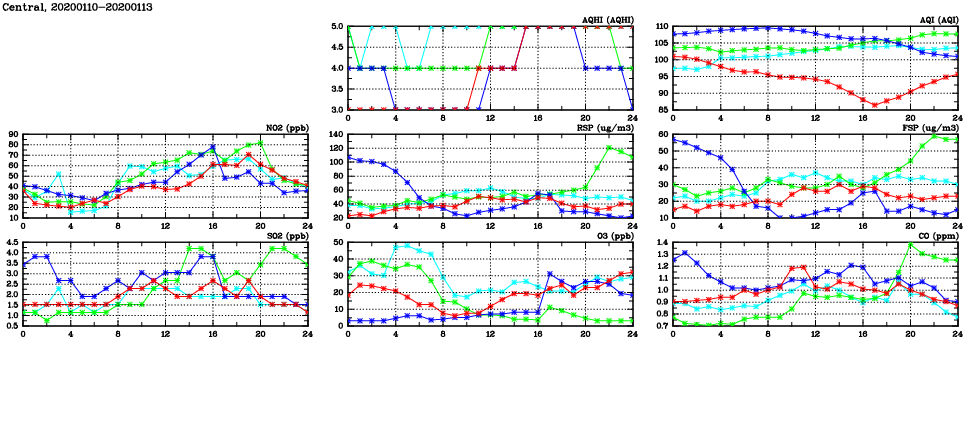 | Air Quality Data Time Series in Central (2020/01/13) | ( Line colors: Day -3 Day -2 Day -1 Current day ) | 2D Map Current AQHI |