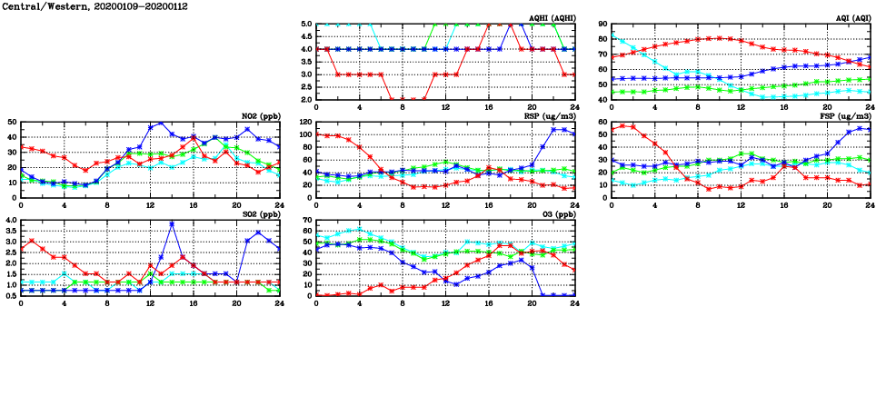 | Air Quality Data Time Series in Central/Western (2020/01/12) | ( Line colors: Day -3 Day -2 Day -1 Current day ) | 2D Map Current AQHI |