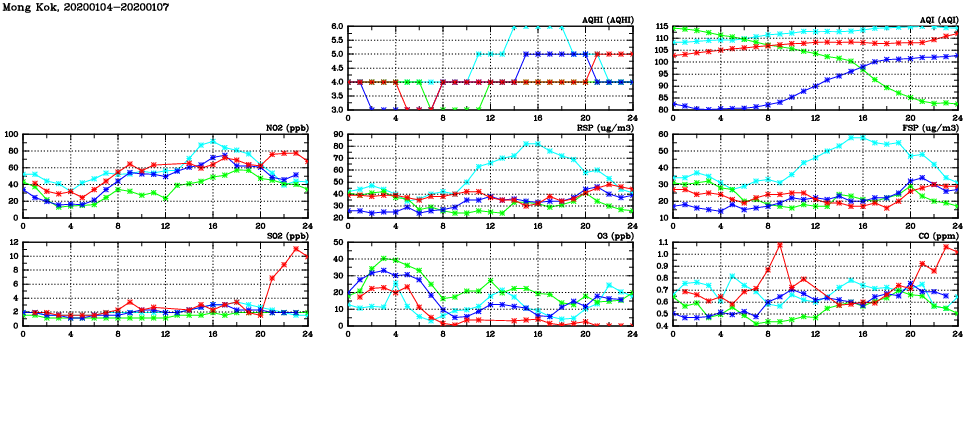 | Air Quality Data Time Series in Mong Kok (2020/01/07) | ( Line colors: Day -3 Day -2 Day -1 Current day ) | 2D Map Current AQHI |
