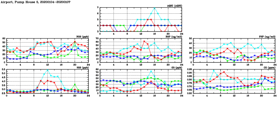 | Air Quality Data Time Series in Airport, Pump House 5 (2020/01/07) | ( Line colors: Day -3 Day -2 Day -1 Current day ) | 2D Map Current AQHI |