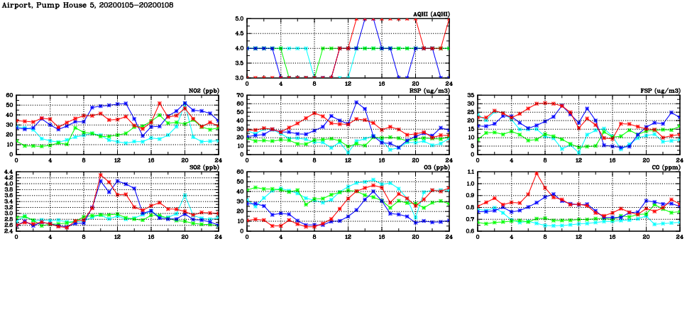 | Air Quality Data Time Series in Airport, Pump House 5 (2020/01/08) | ( Line colors: Day -3 Day -2 Day -1 Current day ) | 2D Map Current AQHI |