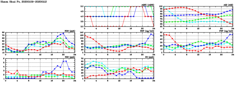| Air Quality Data Time Series in Sham Shui Po (2020/01/12) | ( Line colors: Day -3 Day -2 Day -1 Current day ) | 2D Map Current AQHI |