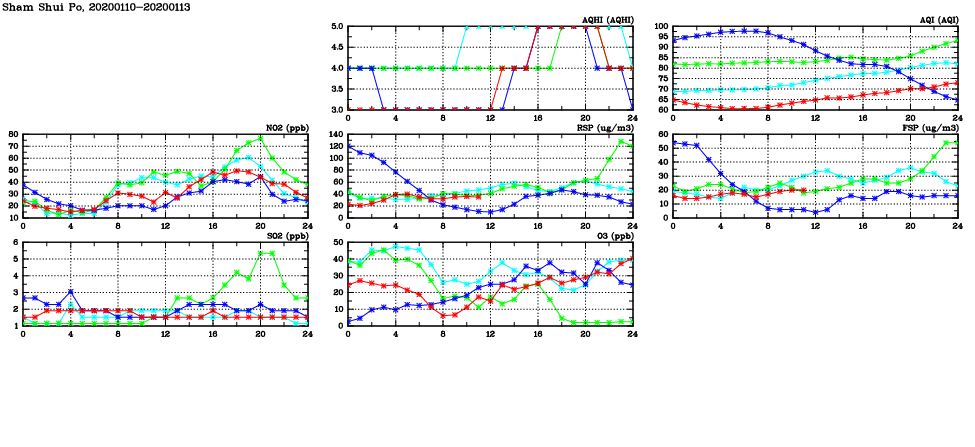 | Air Quality Data Time Series in Sham Shui Po (2020/01/13) | ( Line colors: Day -3 Day -2 Day -1 Current day ) | 2D Map Current AQHI |