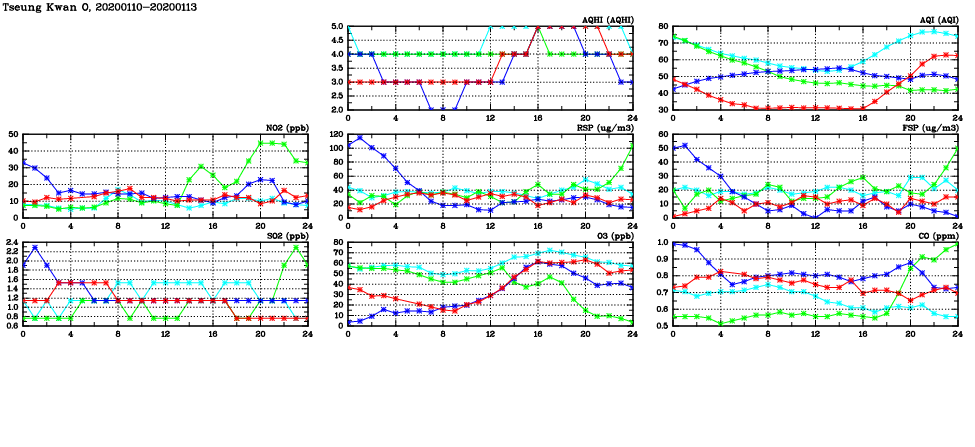 | Air Quality Data Time Series in Tseung Kwan O (2020/01/13) | ( Line colors: Day -3 Day -2 Day -1 Current day ) | 2D Map Current AQHI |