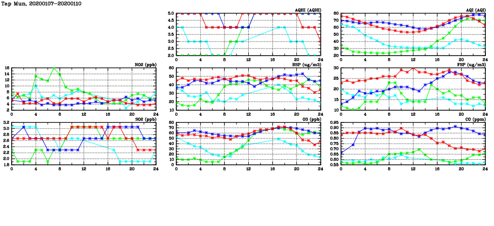 | Air Quality Data Time Series in Tap Mun (2020/01/10) | ( Line colors: Day -3 Day -2 Day -1 Current day ) | 2D Map Current AQHI |
