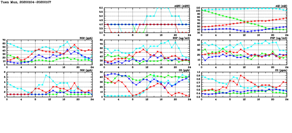 | Air Quality Data Time Series in Tuen Mun (2020/01/07) | ( Line colors: Day -3 Day -2 Day -1 Current day ) | 2D Map Current AQHI |