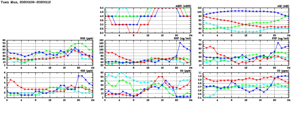 | Air Quality Data Time Series in Tuen Mun (2020/01/12) | ( Line colors: Day -3 Day -2 Day -1 Current day ) | 2D Map Current AQHI |