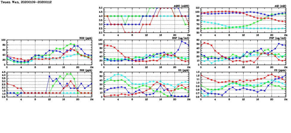 | Air Quality Data Time Series in Tsuen Wan (2020/01/12) | ( Line colors: Day -3 Day -2 Day -1 Current day ) | 2D Map Current AQHI |