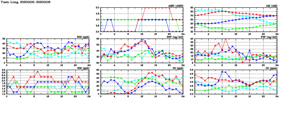 | Air Quality Data Time Series in Yuen Long (2020/01/08) | ( Line colors: Day -3 Day -2 Day -1 Current day ) | 2D Map Current AQHI |