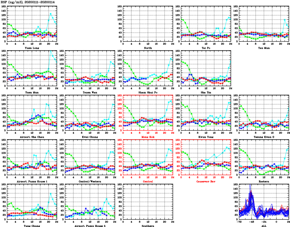 | Air Quality Data Time Series for RSP (2020/01/14) | ( Line colors: Day -3 Day -2 Day -1 Current day ) | 2D Map Current AQHI |