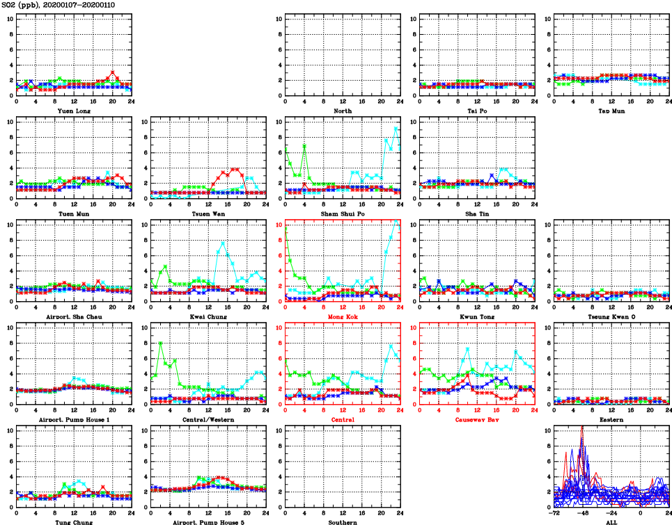 | Air Quality Data Time Series for SO2 (2020/01/10) | ( Line colors: Day -3 Day -2 Day -1 Current day ) | 2D Map Current AQHI |