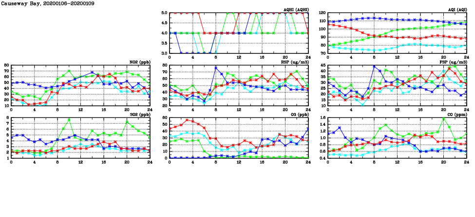 | Air Quality Data Time Series in Causeway Bay (2020/01/09) | ( Line colors: Day -3 Day -2 Day -1 Current day ) | 2D Map Current AQHI |