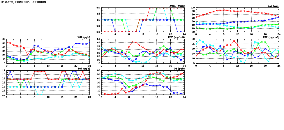 | Air Quality Data Time Series in Eastern (2020/01/08) | ( Line colors: Day -3 Day -2 Day -1 Current day ) | 2D Map Current AQHI |