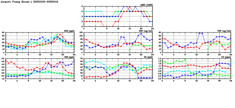 | Air Quality Data Time Series in Airport, Pump House 1 (2020/01/12) | ( Line colors: Day -3 Day -2 Day -1 Current day ) | 2D Map Current AQHI |