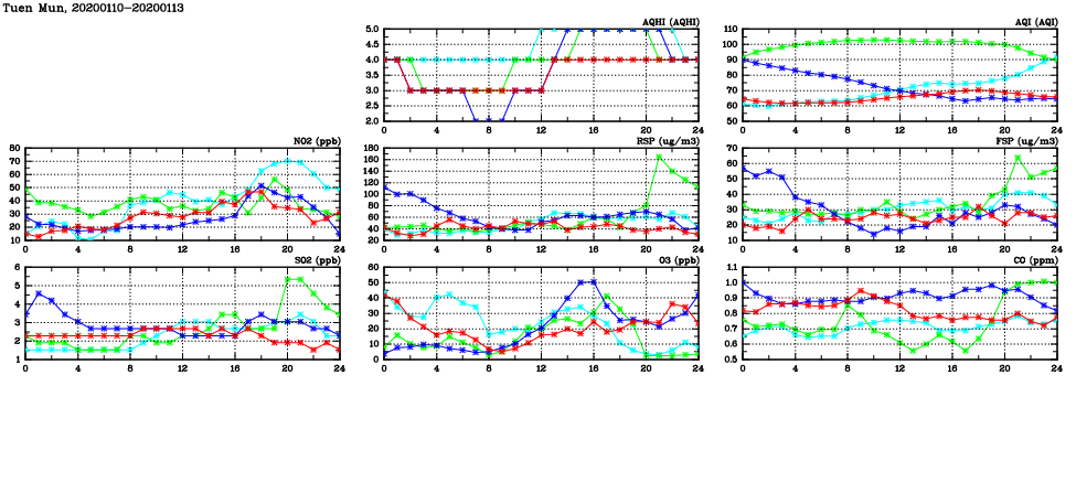 | Air Quality Data Time Series in Tuen Mun (2020/01/13) | ( Line colors: Day -3 Day -2 Day -1 Current day ) | 2D Map Current AQHI |