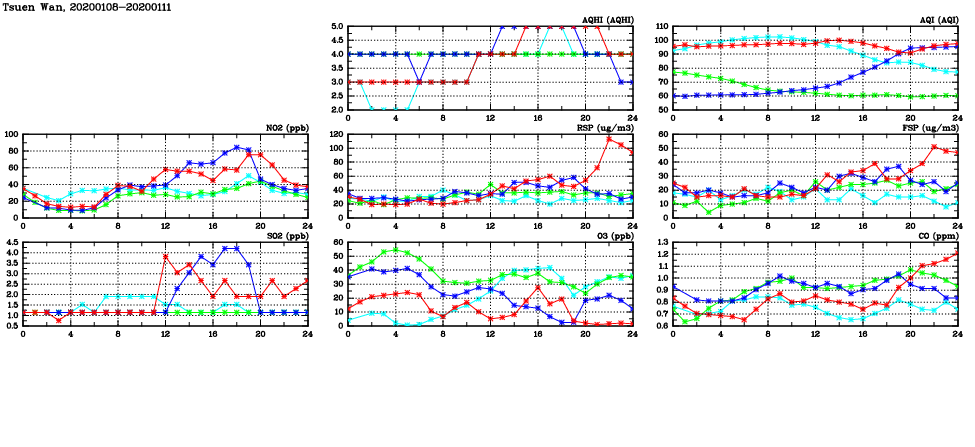 | Air Quality Data Time Series in Tsuen Wan (2020/01/11) | ( Line colors: Day -3 Day -2 Day -1 Current day ) | 2D Map Current AQHI |