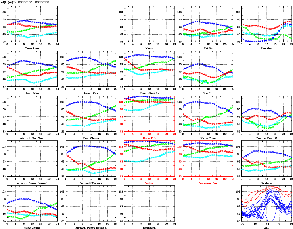 | Air Quality Data Time Series for AQI (2020/01/09) | ( Line colors: Day -3 Day -2 Day -1 Current day ) | 2D Map Current AQHI |