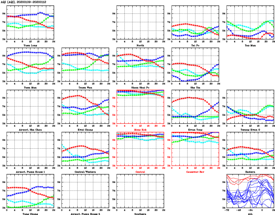| Air Quality Data Time Series for AQI (2020/01/12) | ( Line colors: Day -3 Day -2 Day -1 Current day ) | 2D Map Current AQHI |