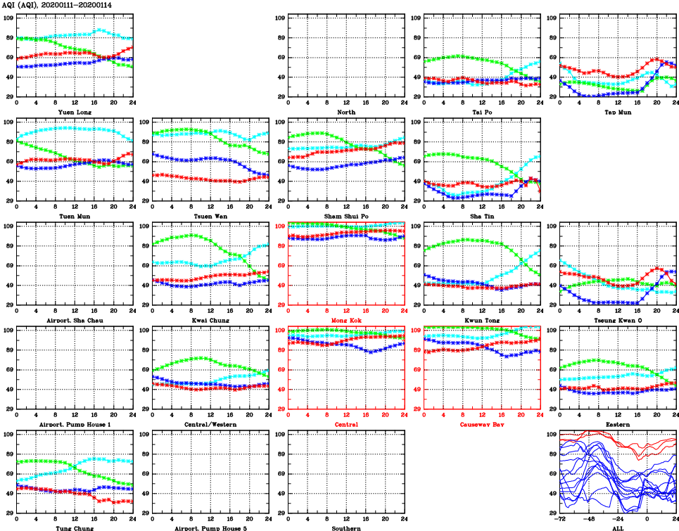 | Air Quality Data Time Series for AQI (2020/01/14) | ( Line colors: Day -3 Day -2 Day -1 Current day ) | 2D Map Current AQHI |