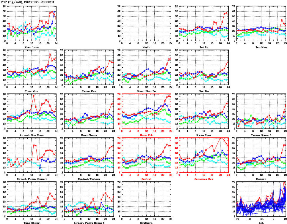 | Air Quality Data Time Series for FSP (2020/01/11) | ( Line colors: Day -3 Day -2 Day -1 Current day ) | 2D Map Current AQHI |