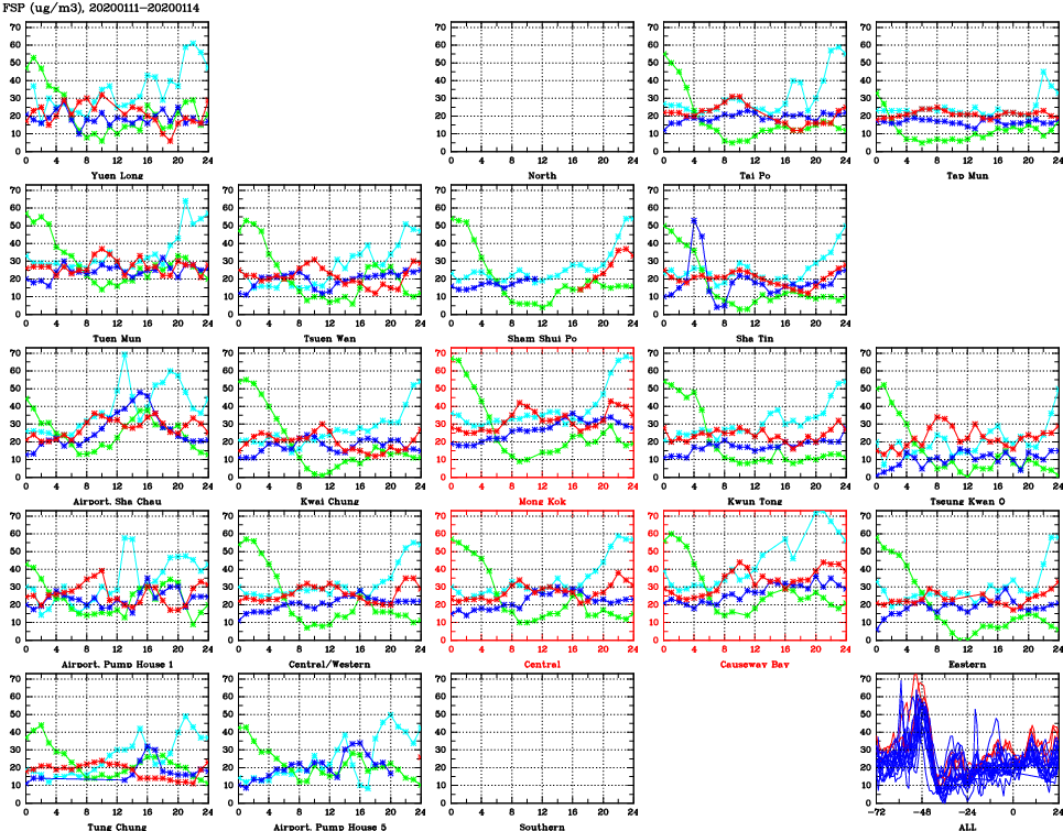 | Air Quality Data Time Series for FSP (2020/01/14) | ( Line colors: Day -3 Day -2 Day -1 Current day ) | 2D Map Current AQHI |
